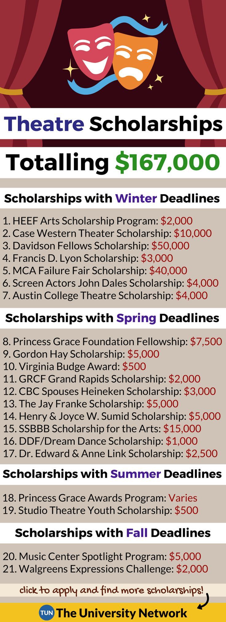 - National and regional organizations: Foundations, arts councils, and theatre associations often have scholarship programs. These might be open to students across a wider geographical area.